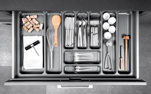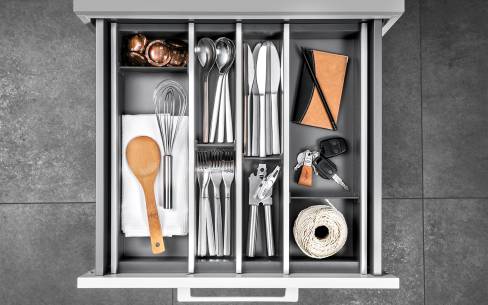 Flexible Besteckeinteilung | Nicht nur ein wahrer Hingucker, sondern auch praktisch und hygienisch stellt sich der transluzente Besteckeinsatz dar. Trennstege lassen sich abnehmen, damit die Quereinteiler ganz nach Bedarf versetzt und die Fächer einfach gereinigt werden können. Die Stege lassen sich danach einfach wieder aufschieben.